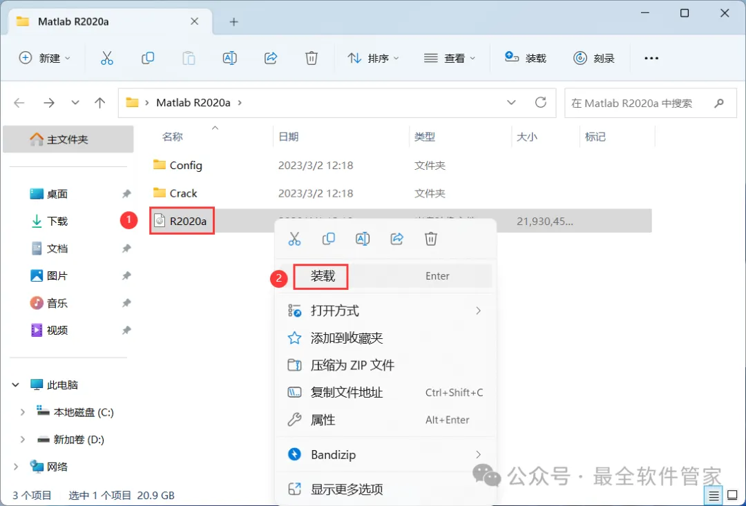 3、找到【R2020a】文件,右键点击【装载】