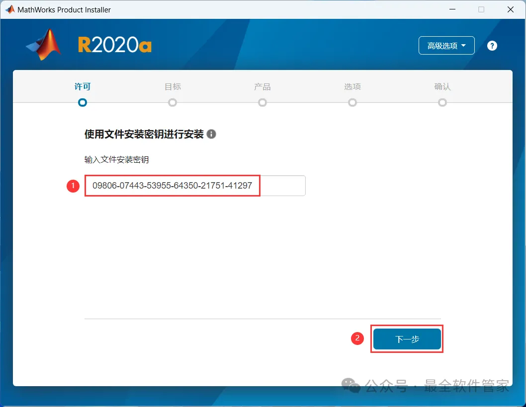 5、依次点击【高级选项】、【我有文件安装密钥】