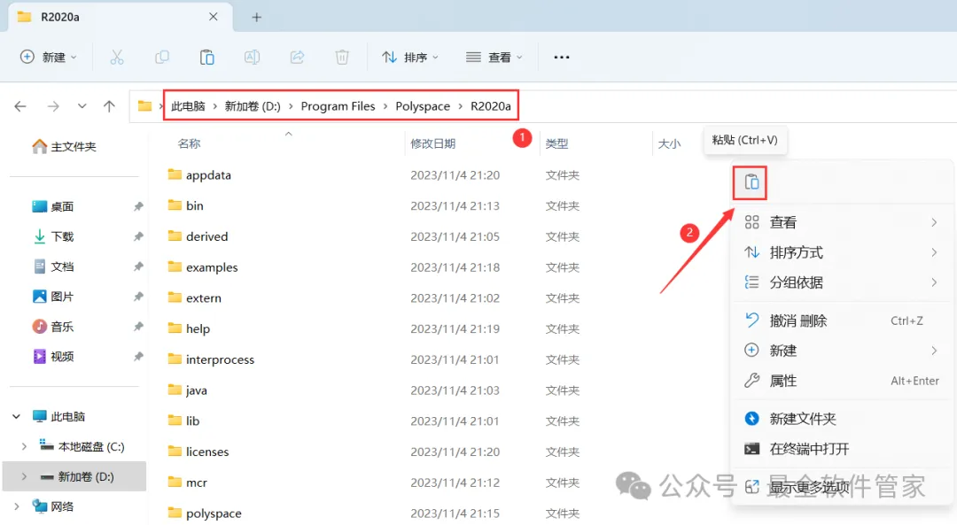 18、打开路径:D:\Program Files\Polyspace\R2020a,再右键文件夹的空白处,点击【粘贴按钮】