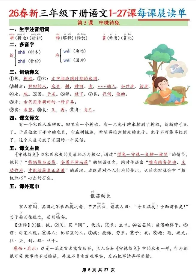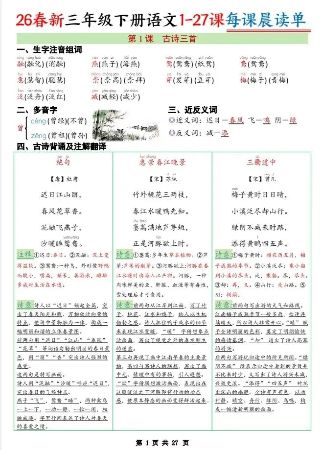 文末免费下载|【26春新三下语文全册1-27课每课晨读单27页