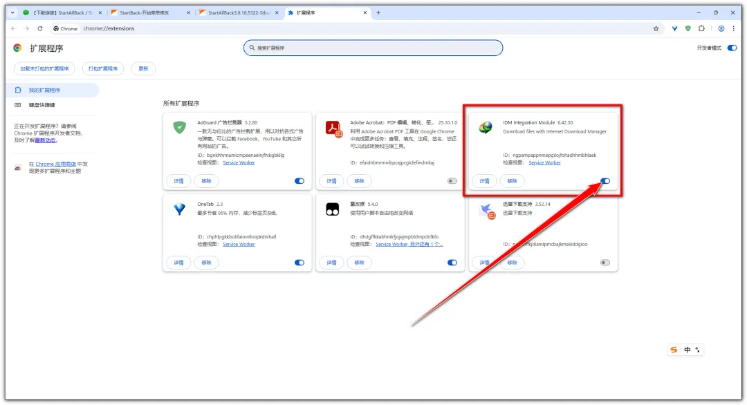 在扩展列表里找到IDM对应的扩展插件,把旁边的开关打开就好啦~✅