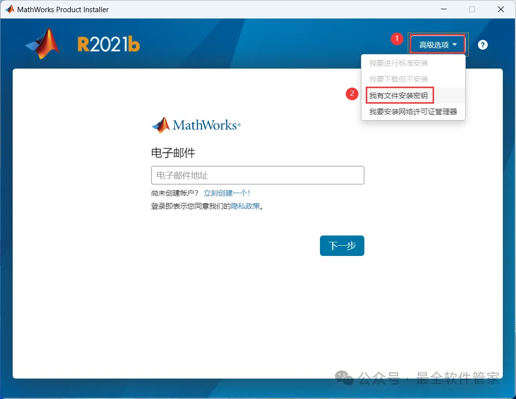 5、依次点击【高级选项】、【我有文件安装密钥】