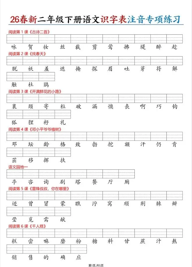 今天给大家整理了26春二下语文识字表注音专项练习(含答案11页),转发给朋友或班级群,受益更多人,帮助孩子学习!