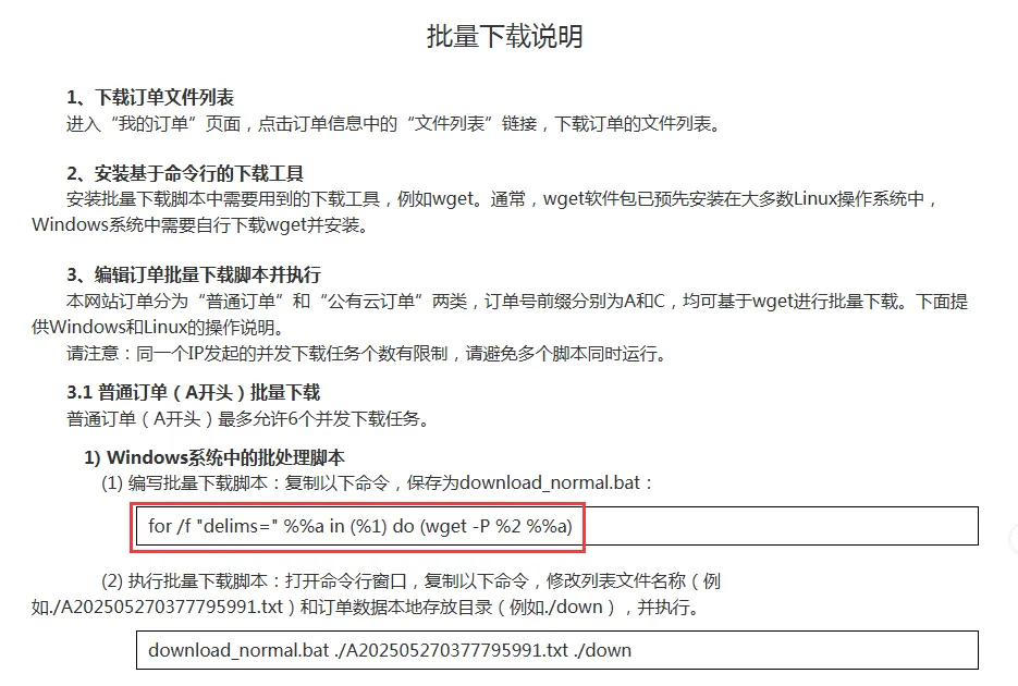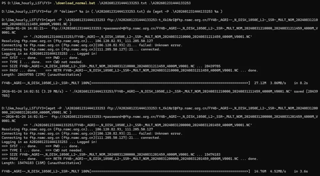 PS D:\1km_hourly_LST\FY3> .\download_normal.bat .\A202601231444133253.txt .\A202601231444133253此时不应有 f。D:\1km_hourly_LST\FY3>for f delims= %a in (.\A202601231444133253.txt) do (wget -P .\A202601231444133253 %a)