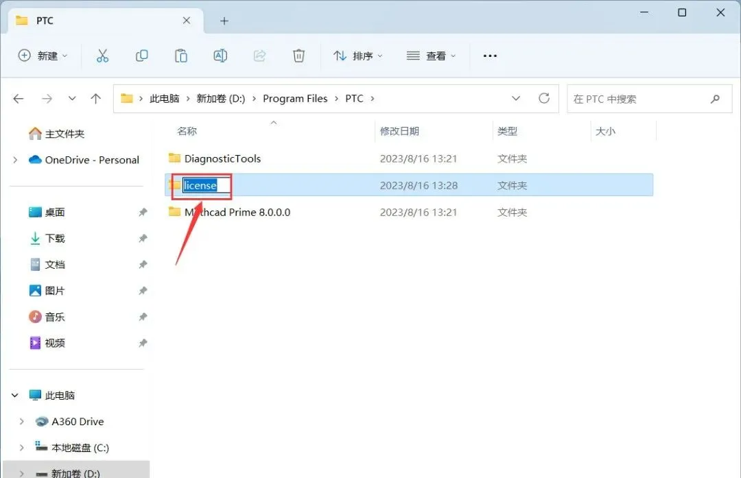 15、打开路径:D:\Program Files\PTC,右键点击【新建文件夹】