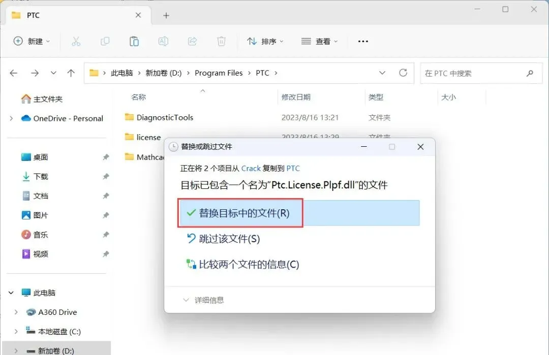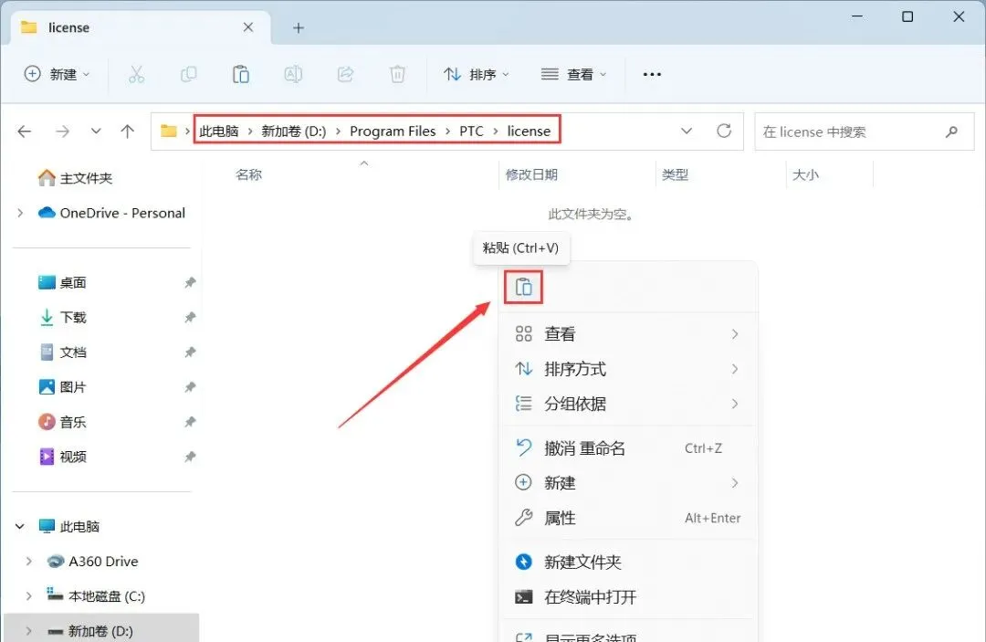 17、打开路径:D:\Program Files\PTC\ license,再右键文件夹的空白处,点击【粘贴按钮】
