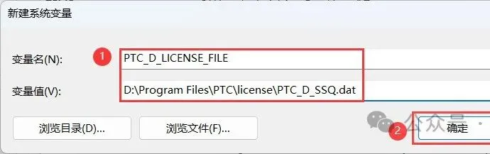22、变量名输入:PTC_D_LICENSE_FILE;变量值输入:D:\Program Files\PTC\ license\ PTC_D_SSQ.dat,再点击【确定】