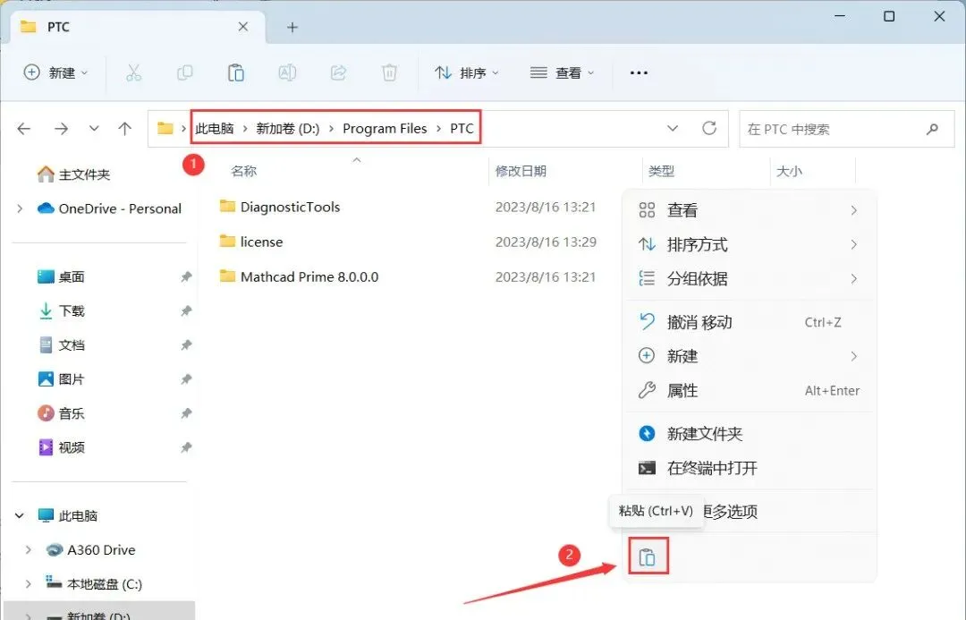 26、打开路径:D:\Program Files\PTC,再右键文件夹的空白处,点击【粘贴按钮】