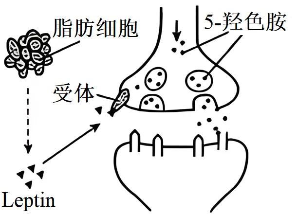 10.脂肪细胞分泌的生物活性蛋白Leptin可使兴奋性递质5-羟色胺的合成和释放减少,阻碍神经元之间的兴奋传递,如图所示。下列相关叙述错误的是()