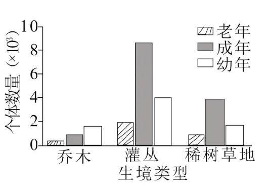 17.某岛屿上分布一种特有的爬行动物,以多种候鸟为食,候鸟主要栖息在灌丛和稀树草地。图示该爬行动物在不同生境下的年龄组成,下列相关叙述正确的有()