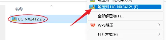 1.解压安装包:鼠标右击【UG NX 2412】压缩包,选择电脑上安装的解压软件,点击【解压到UG NX 2412】。