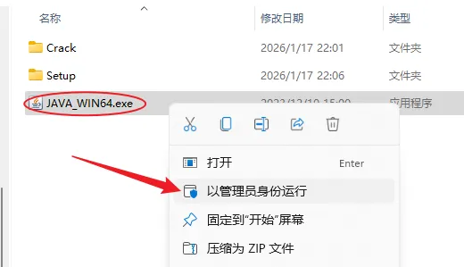 3.打开解压后的文件夹,鼠标右击【JAVA_WIN64】选择【以管理员身份运行】。