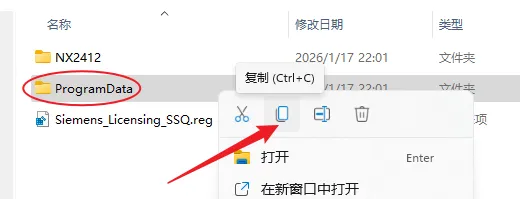 11.打开安装包解压后的【UG NX2412】文件夹中的【Crack】文件夹,鼠标右击【ProgramData】文件夹选择【复制】。