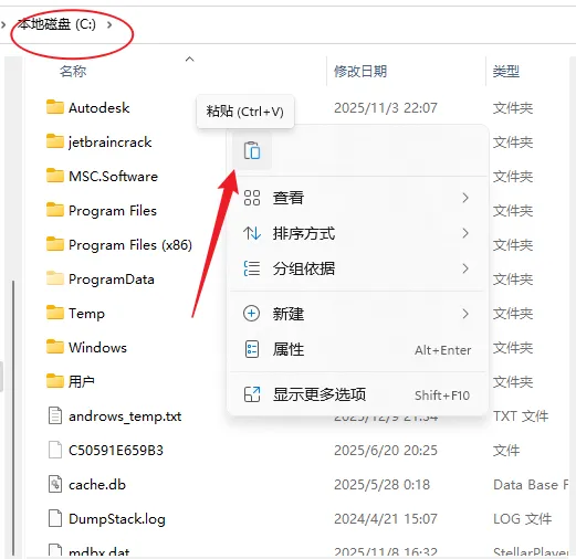 12.打开电脑C盘,鼠标右击空白处选择【粘贴】。