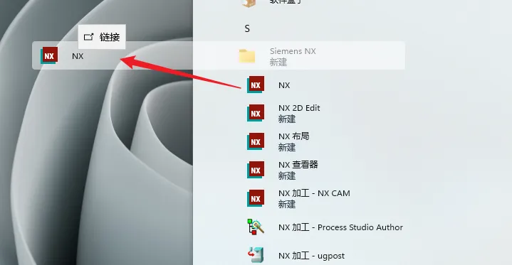 30.创建桌面快捷方式:①点击桌面任务栏中的【开始图标】>点击【所有应用】>双击展开【Siemens NX】文件夹②将【NX】图标拖到电脑桌面。