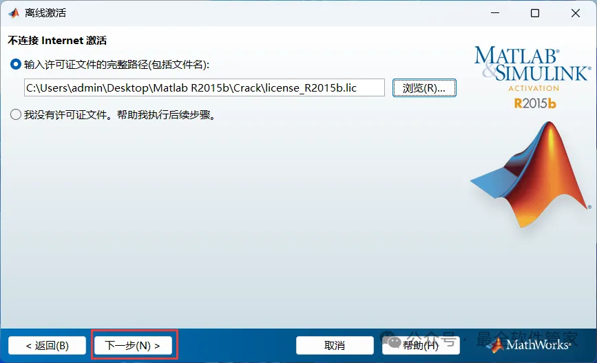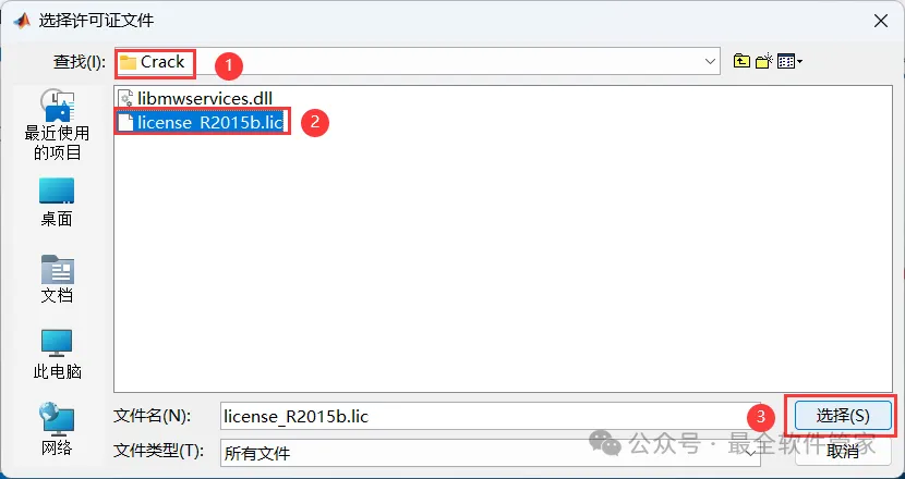 17、找到并选中安装包Crack文件夹下的【License_R2015b.lic】,再点击【选择】
