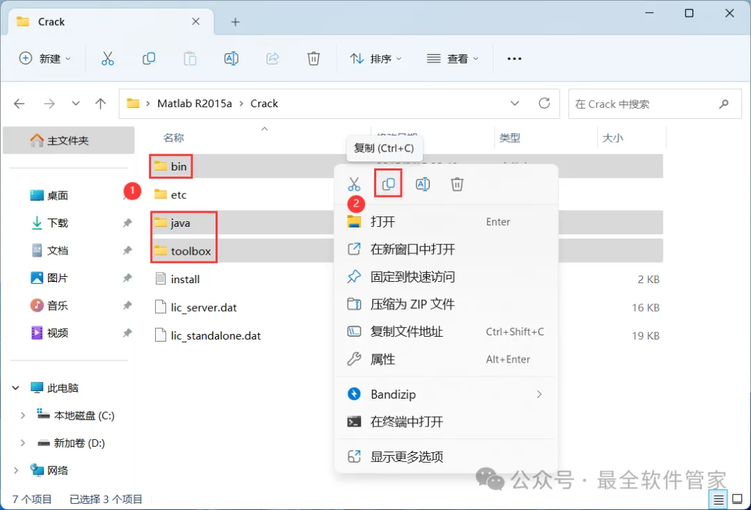 15、找到并选中【bin】、【java】和【toolbox】文件夹,再右键点击【复制按钮】