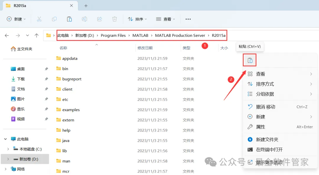16、打开路径:D:\Program Files\MATLAB\ MATLAB Production Server\R2015a,再右键文件夹的空白处,点击【粘贴按钮】
