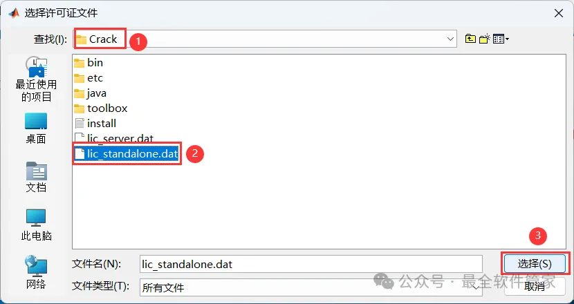 23、找到并选中安装包Crack文件夹下的【lic_standalone.dat】,再点击【选择】