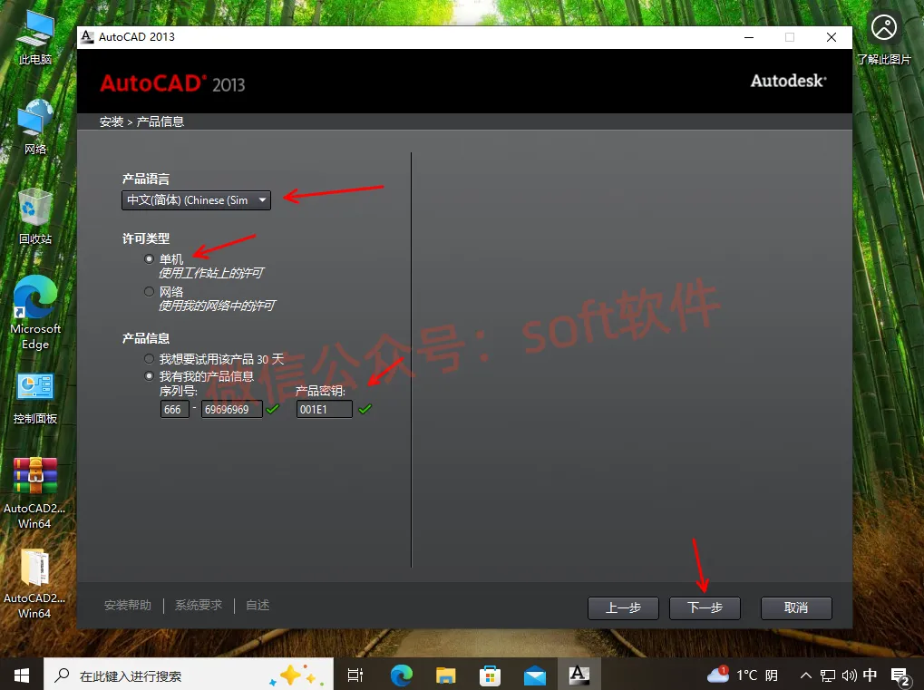 5,许可类型选单机输入序列号666-69696969,产品密钥001E1,点击下一步