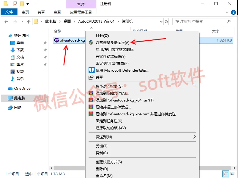 14,回到第一步解压生成的安装包里面,打开注册机文件夹,找到注册机文件,右键以管理员身份运行。若无该文件,检查杀毒软件或者window安全中心是否关闭。解决办法为关闭杀毒和window安全中心,重新解压安装包
