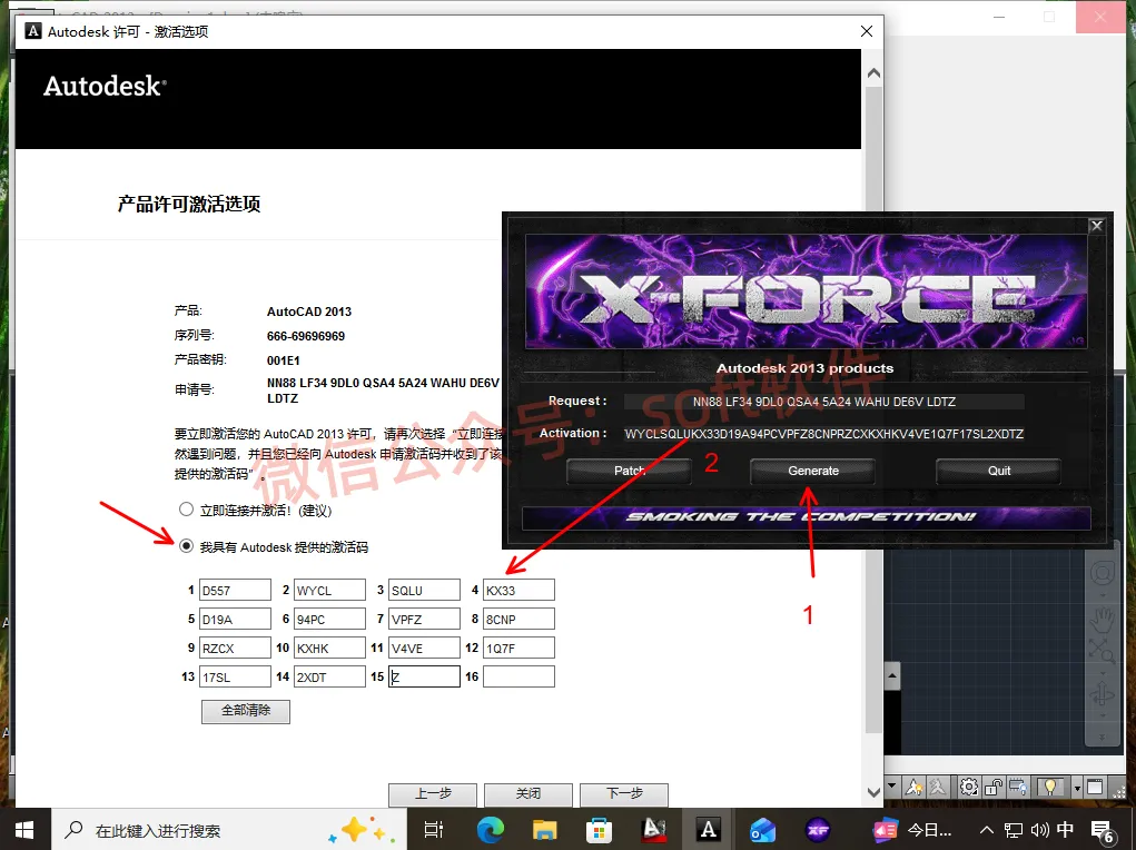 16,点击Generate生成激活码,将生成的激活码按Ctrl+C复制,按Ctrl+V粘贴到键入激活码方框中
