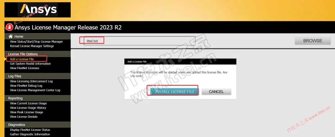 8、点击Add a License File,点击browse指向刚保存的ittel.txt文件,点击INSTALL LICENSE FILE