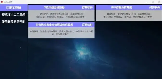 在短视频创作领域,江湖工具箱正成为数百万用户的首选工具。这款专注于多平台内容管理的Windows端软件,深度适配抖音、快手、小红书、TikTok等主流平台,通过二十余项专业功能模块,为创作者提供从内容获取到作品优化的全流程解决方案。