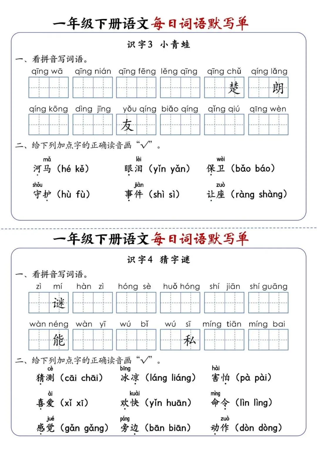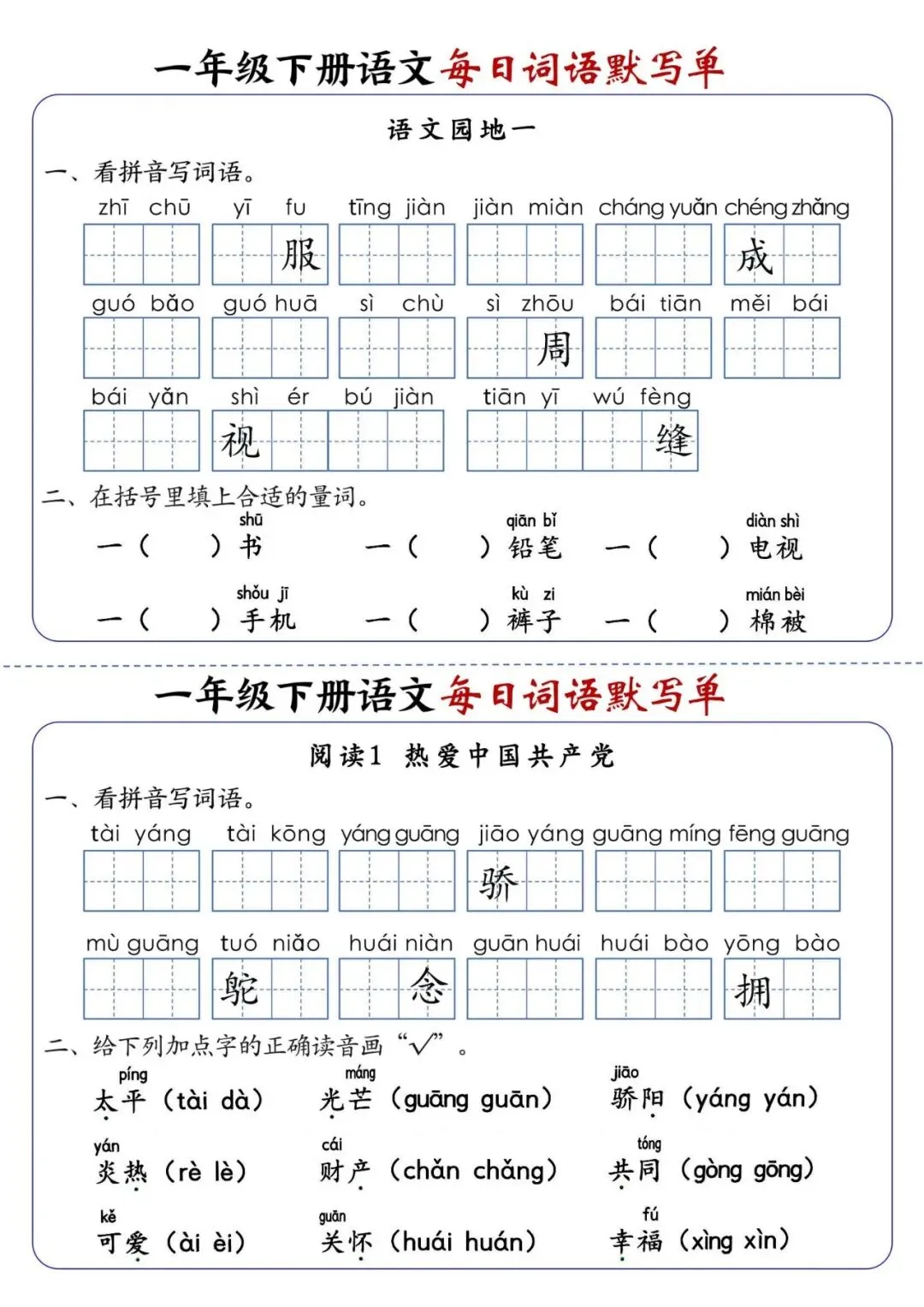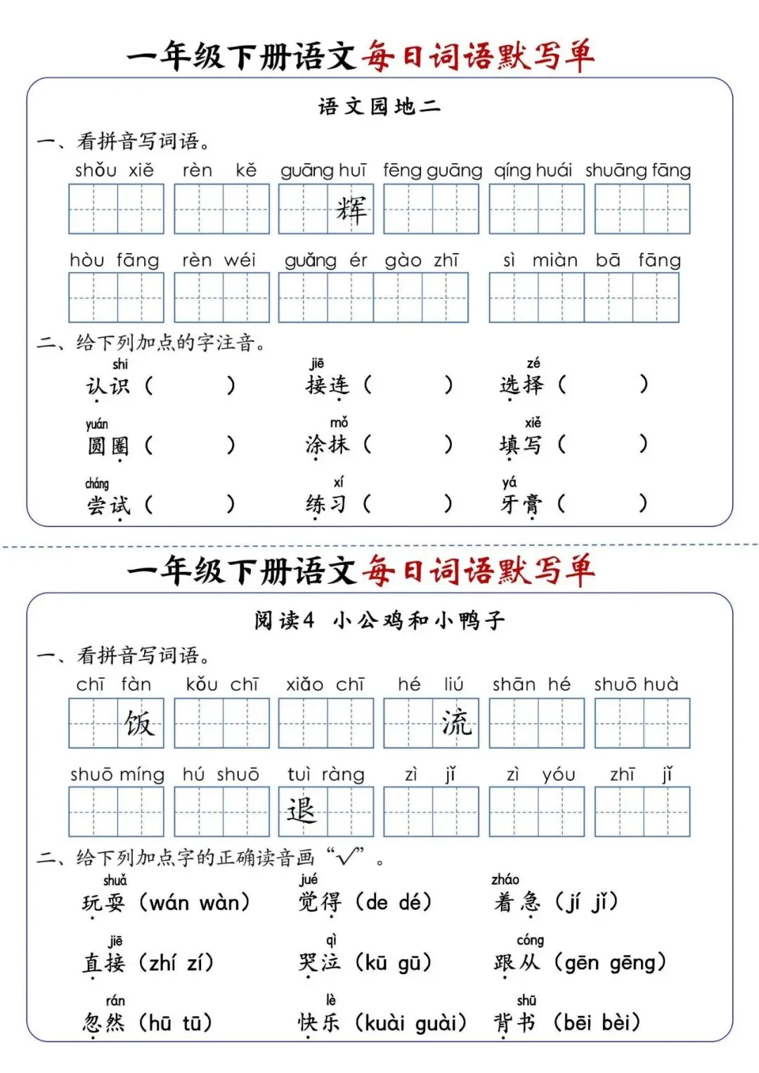 26春一下丨语文 全册每日词语默写单 可免费下载打印