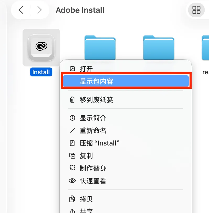 1、在Adobe Install文件夹中,在Install图标上右键,单击显示包内容。