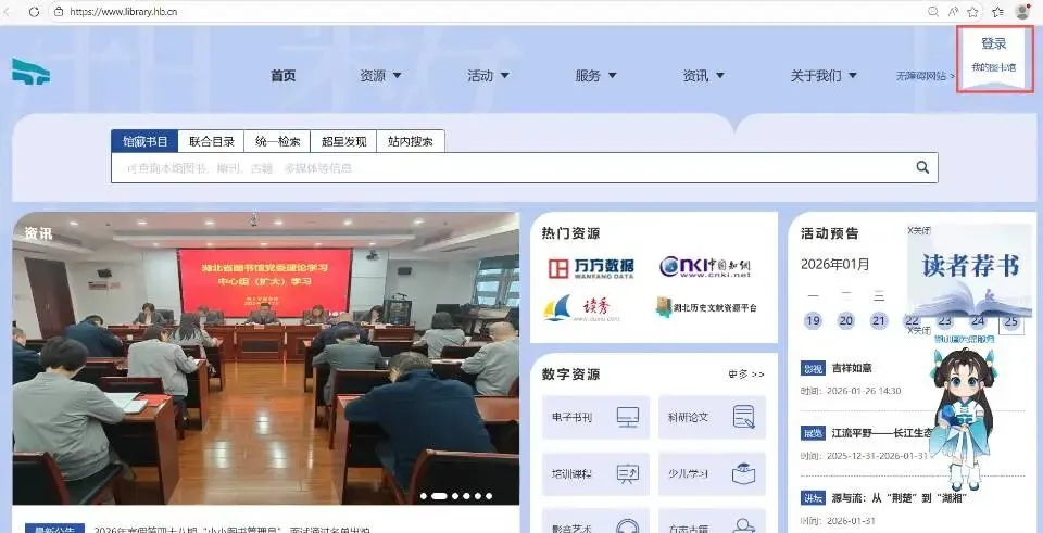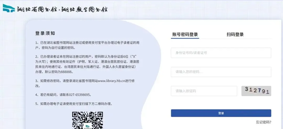 第二步 使用已办理的电子证账号和密码,登录湖北省图书馆(https://www.library.hb.cn/)。