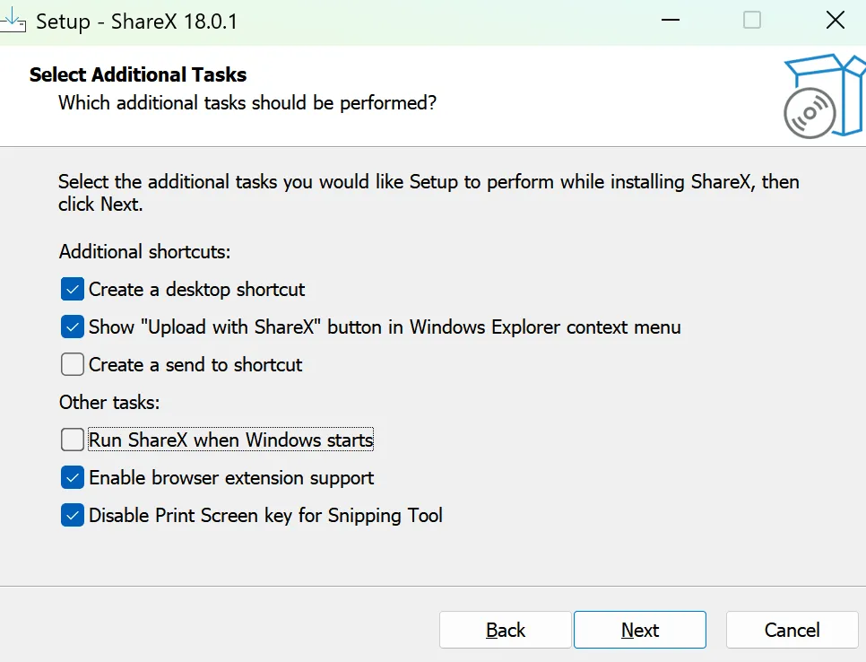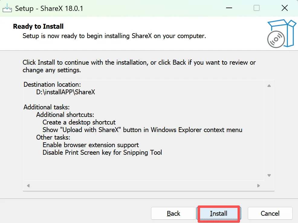 此处示例,更改到 D:\installAPP\ShareX ,点击next