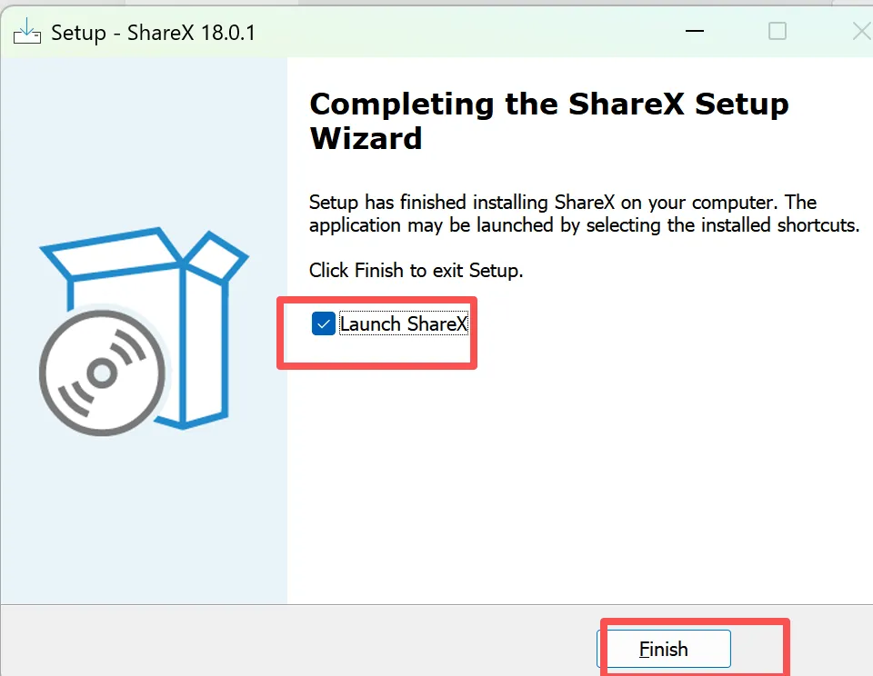 5、待安装完成后,显示完成页面,默认勾选 launch ShareX 的选项,若不想现在启动此软件,则取消勾选。然后点击Finsh,即可完成安装。