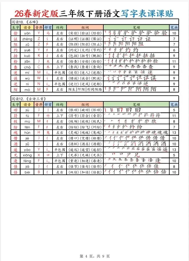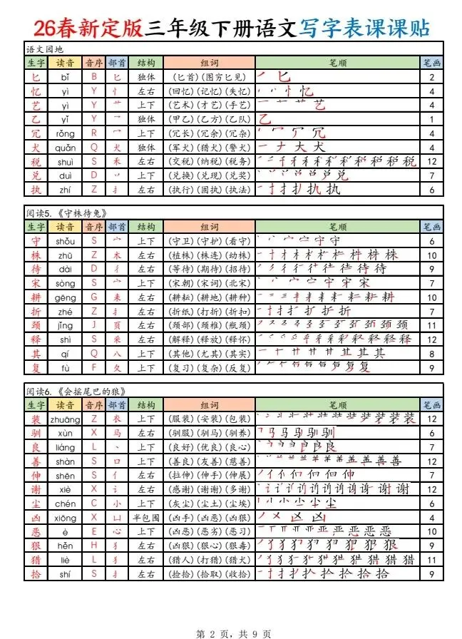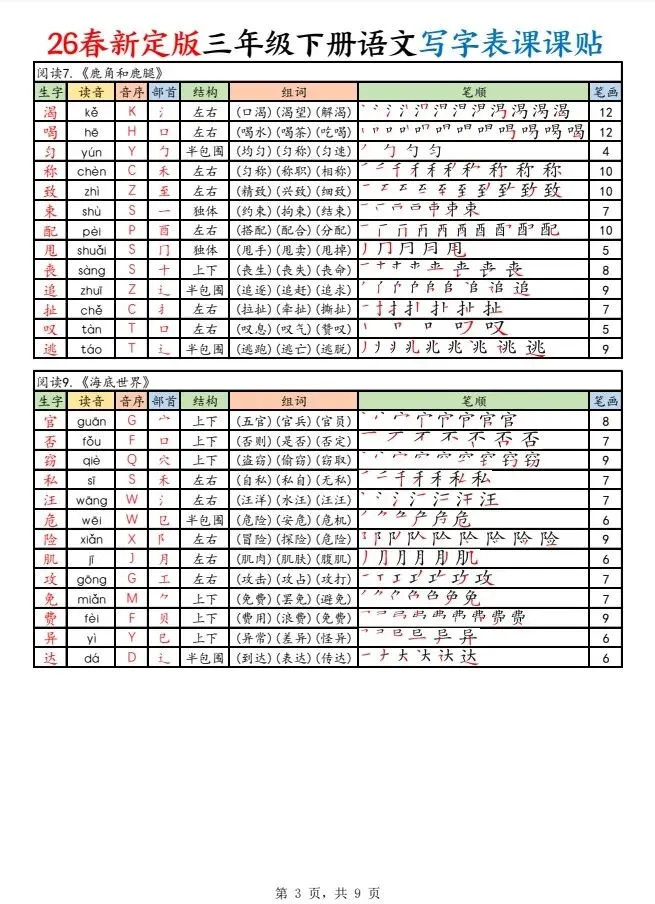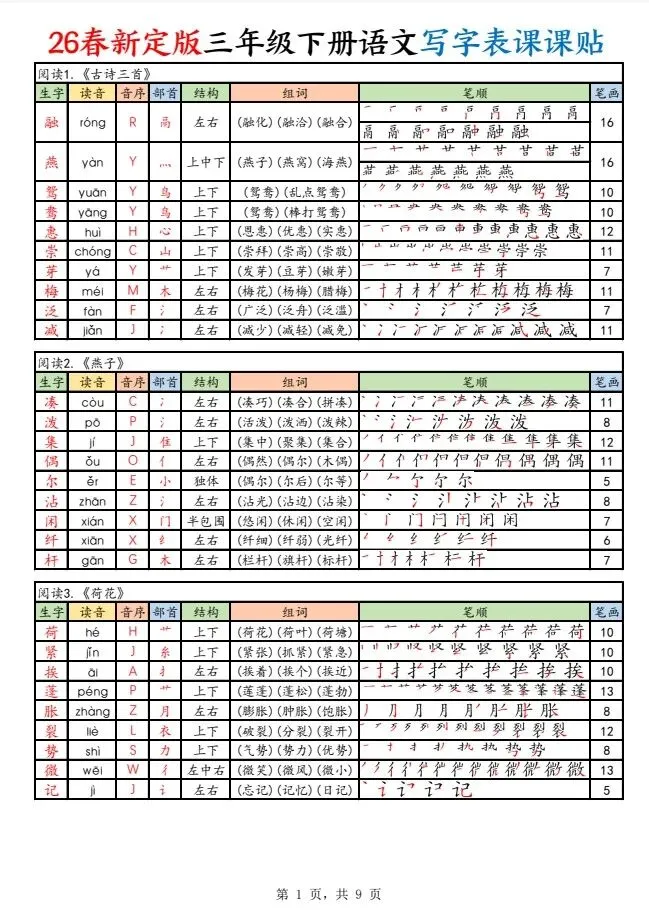 今天给大家整理了26春新定版三下语文写字表课课贴(250字),转发给朋友或班级群,受益更多人,帮助孩子学习!