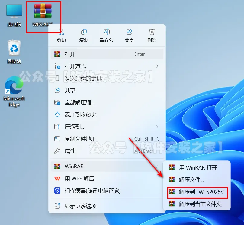 1.鼠标右键【WPS2025】压缩包,选择【解压到WPS2025】。