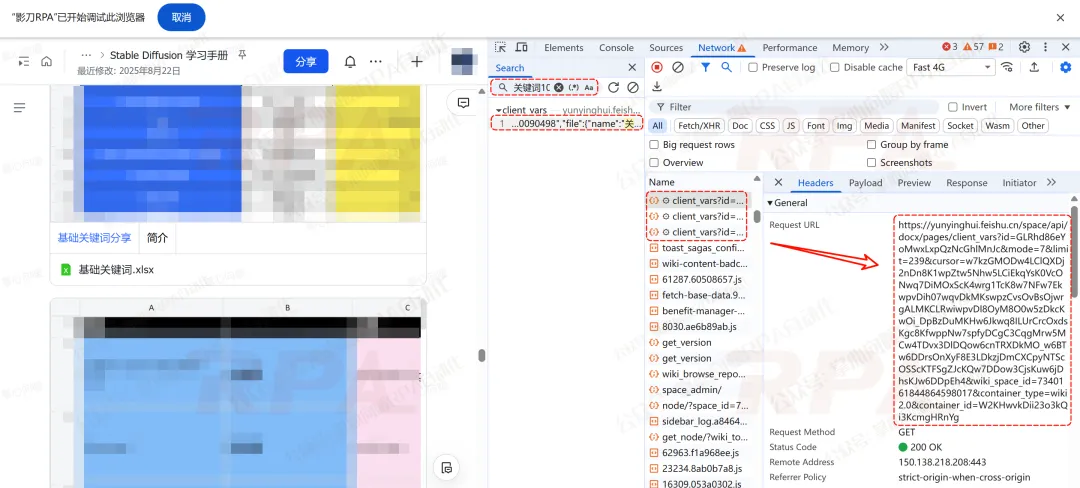 也就是在应用启动参数里输入的飞书链接。RPA机器人先打开它,并从页面加载过程里拿到关键接口的返回值。