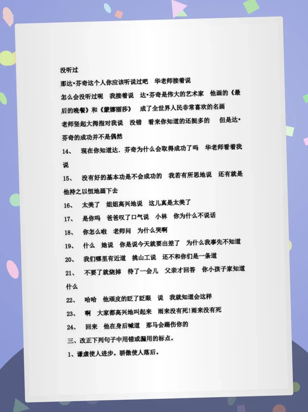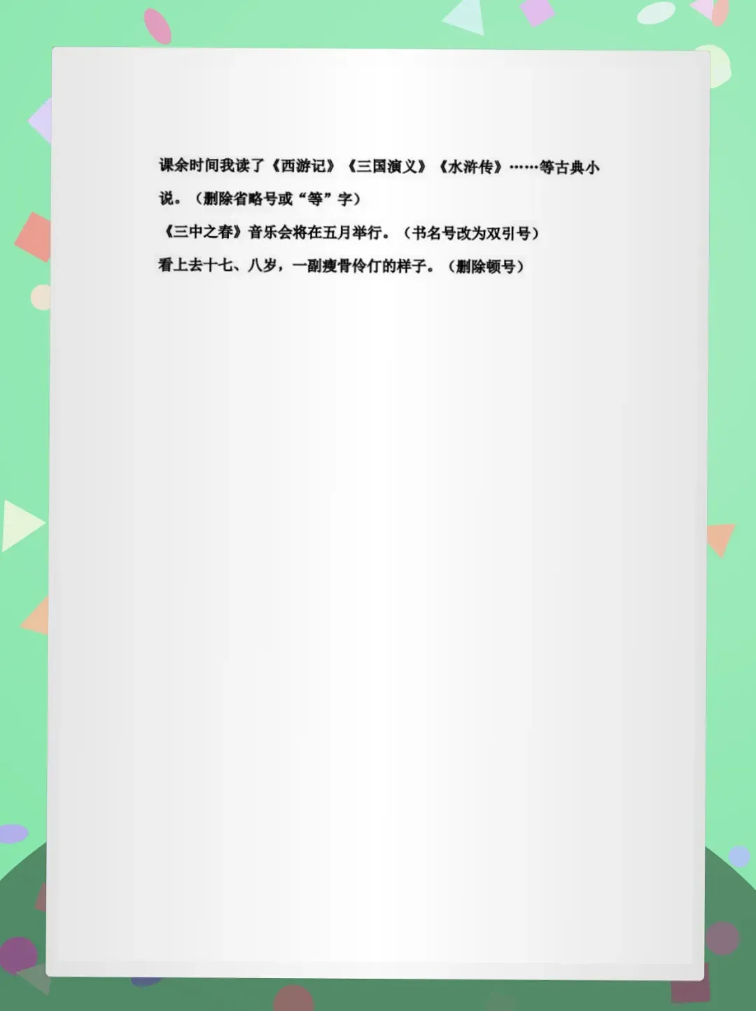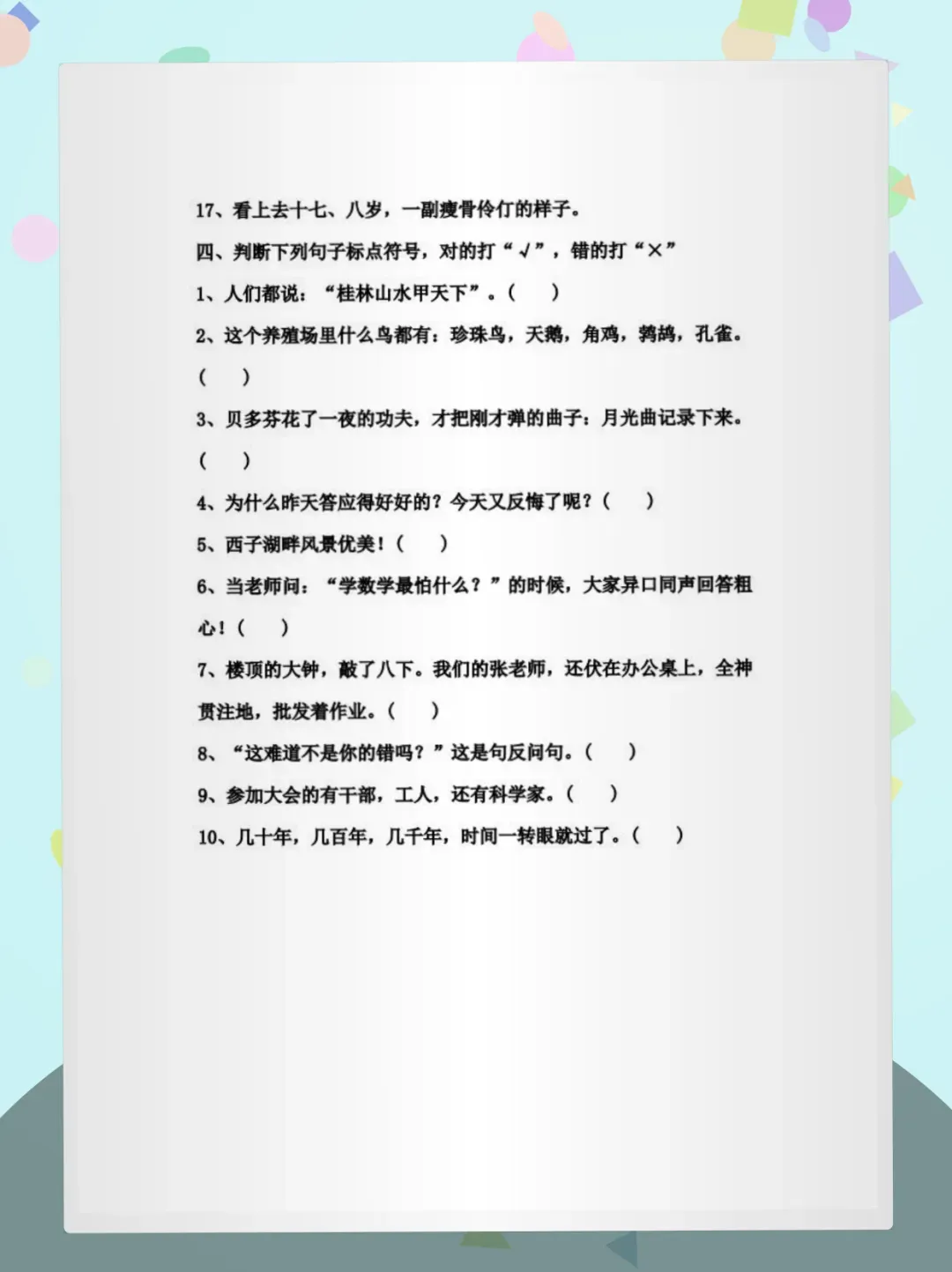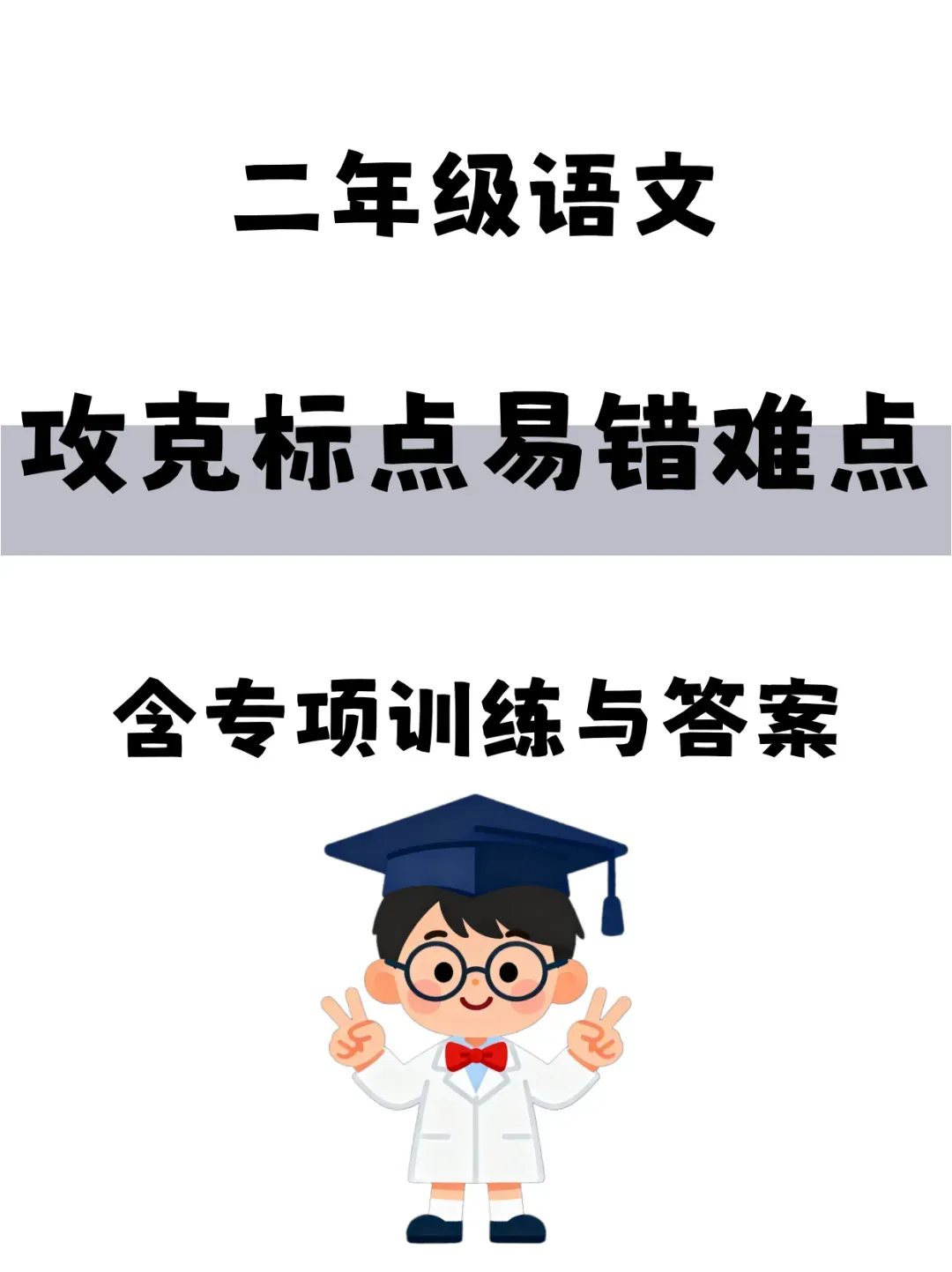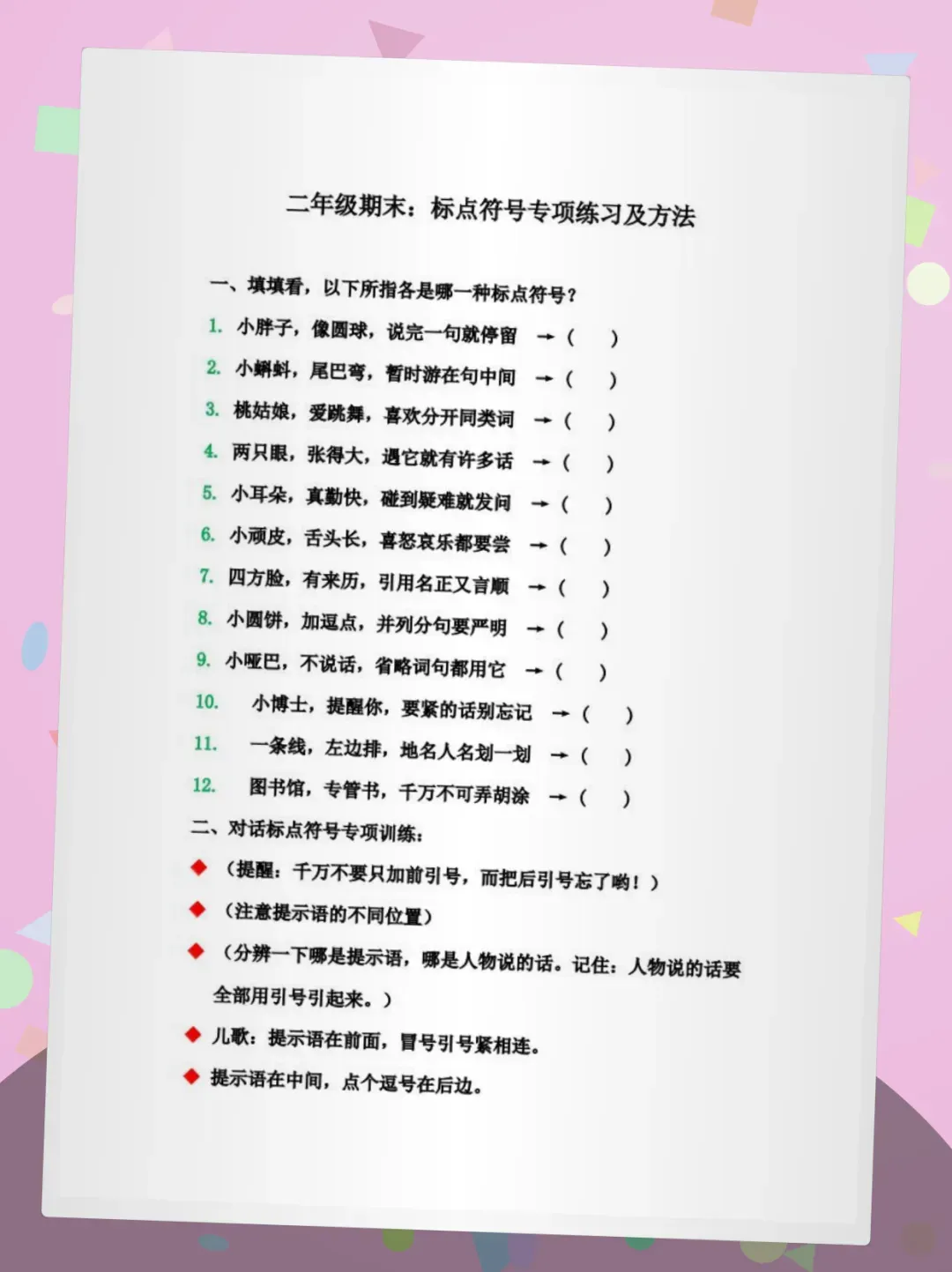 ✨核心亮点:专为二年级孩子设计的标点符号专项练习,涵盖填空、改错、判断、对话训练四大题型,趣味儿歌+清晰规则,轻松掌握标点使用规范!