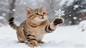 饼干猫第一次见到雪,伸出小爪子接住一片: