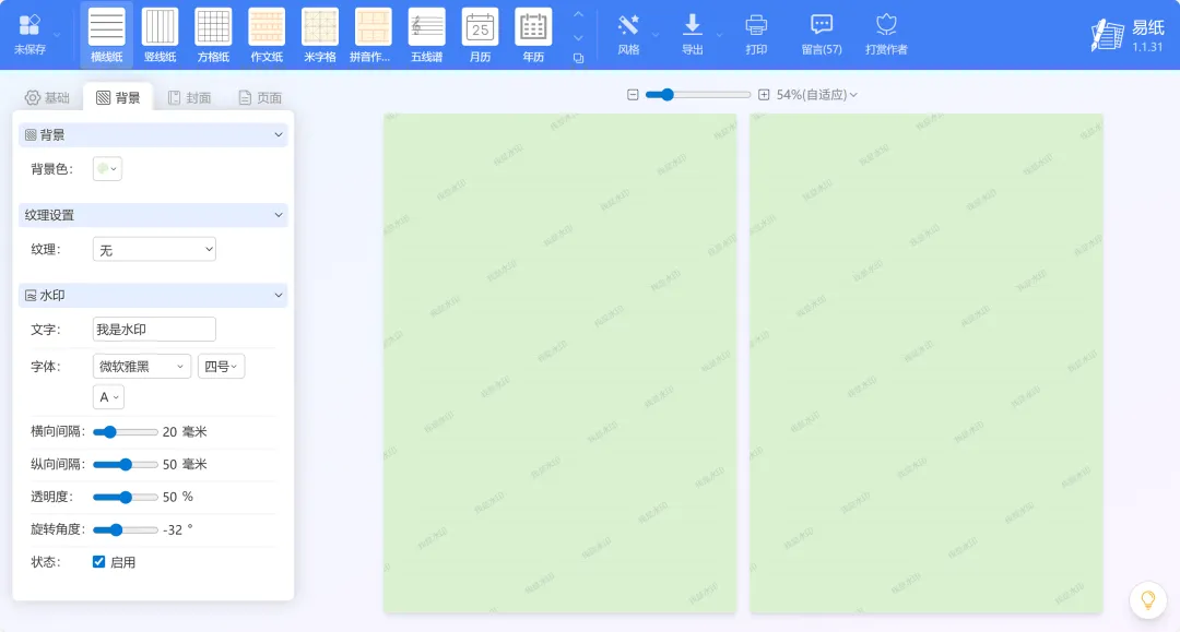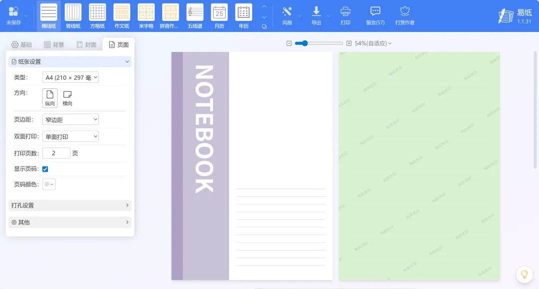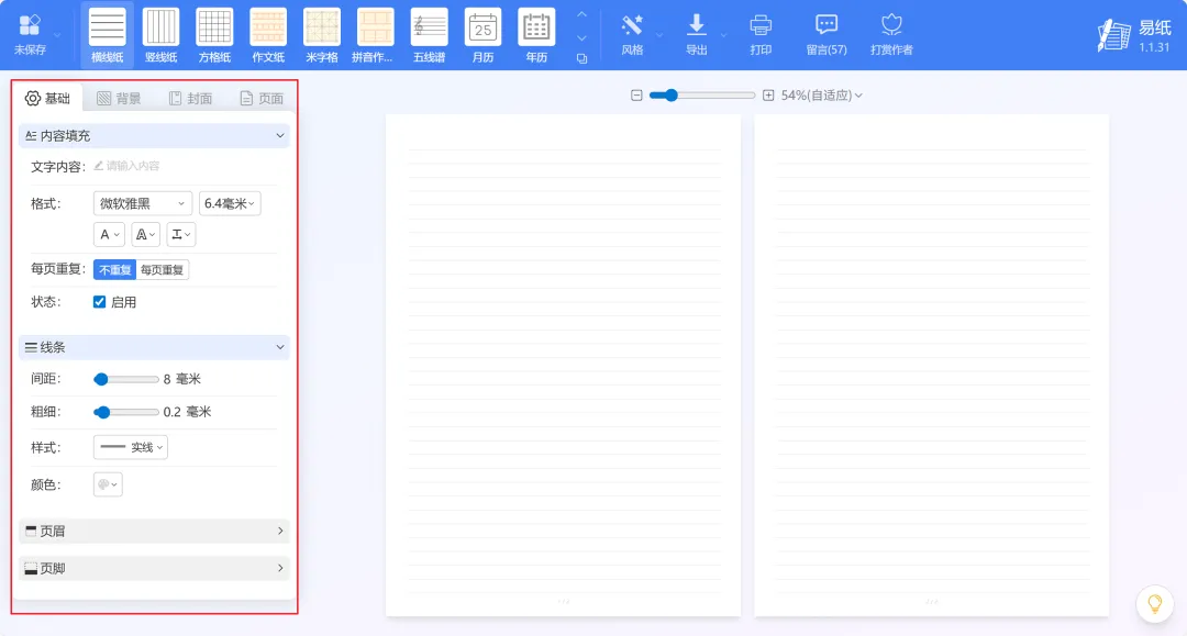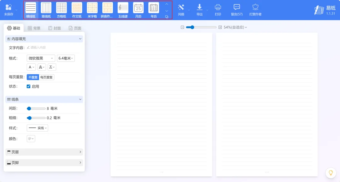 易纸 是一个免费在线稿纸设计与下载工具网站,无需注册登录账号即可使用。它提供了30多种打印模板,对学生、老师、书法爱好者者等很有帮助,适用范围很广。选择正确的网站进入,网址:https://paper.tthaoke.com/常见类型有横线纸、竖线纸、方格纸、作文纸、拼音作业纸、五线谱、月历和年历;中文作业类型有算数纸、英语作业纸、练习纸、回宫格、九宫格、田字格、硬笔回宫格、错题纸;笔记类型有康奈尔笔记、提纲笔记、草图纸、思维导图、每月打卡、创意记录纸、便签纸、信笺纸;其他的有课程表、法式田字格、等距网格、分镜纸、六边形网络、点阵纸和空白纸。左侧功能区支持自定义设置,包括调整线条颜色和粗细、添加页眉页脚和文字内容、