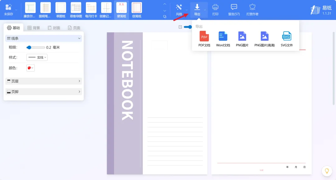 设置好模板后,可以导出为PDF 、Word 、PNG 高清图片、SVG 文件,