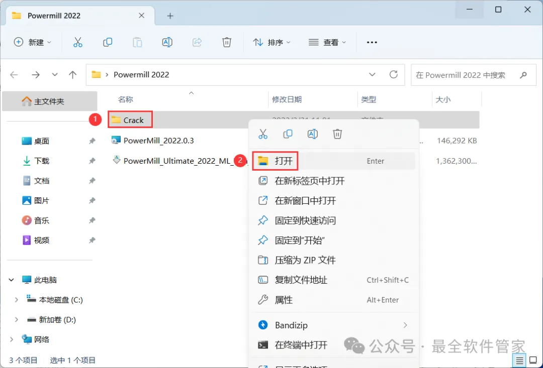 10、回到PowerMill 2022文件夹,找到【Crack】文件夹,右键【打开】它