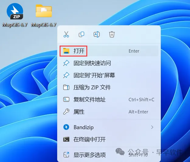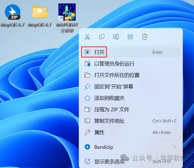 15、回到桌面,右键桌面上的【MAPGIS67主菜单软件图标】,点击【打开】