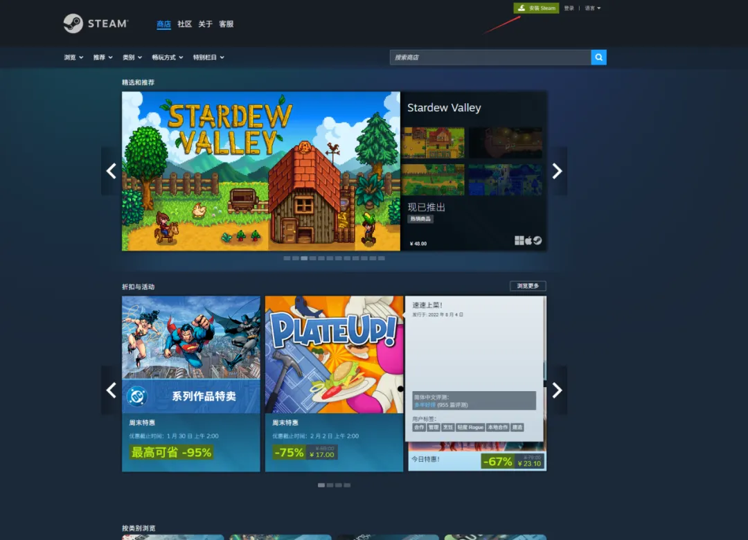 页面加载完成后,右上角会显示 “安装 Steam” 按钮,点击进入下载页面。