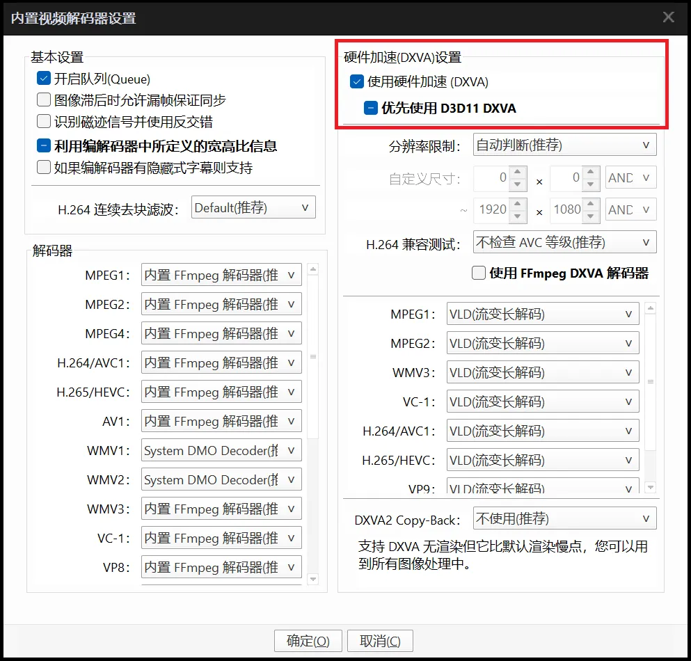 硬解选项:建议勾选"Detect H/W decoder/encoder"选项,以便启用硬件解码