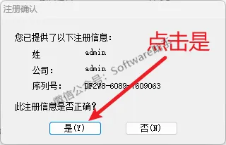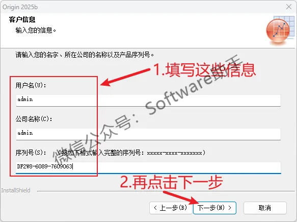 7.填写安装信息:①输入用户名和公司名称【admin】②输入序列号【DF2W8-6089-7609063】③点击【下一步】。