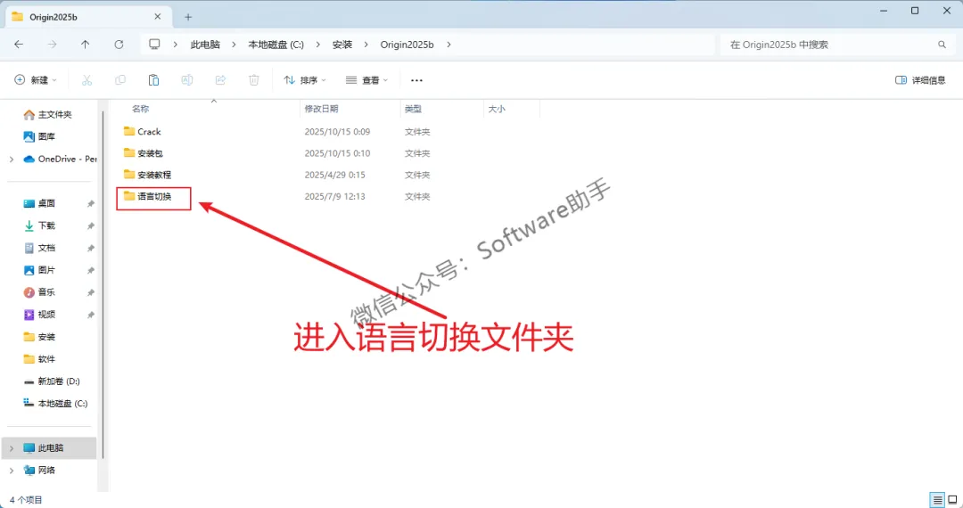 29.返回到【Origin 2025】文件夹,再进入【语言切换】文件夹