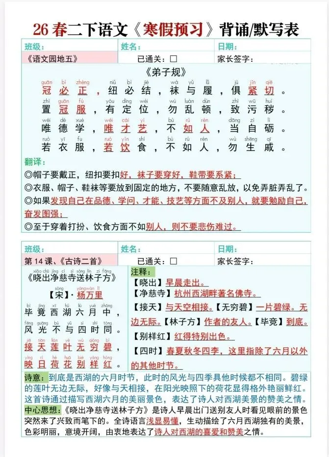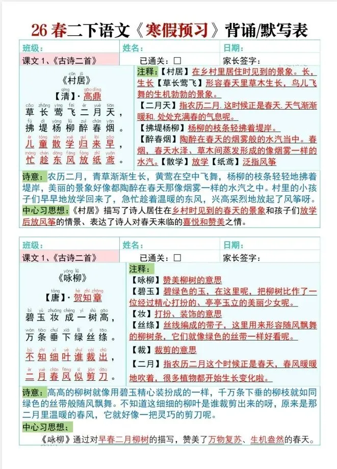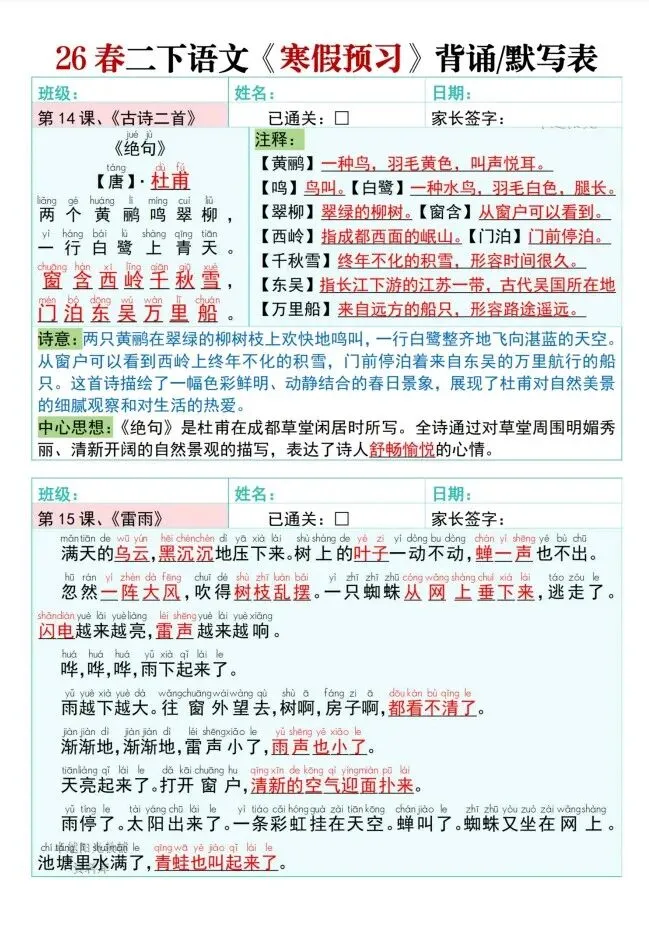 文末免费下载|26春二下语文《寒假预习》背诵默写表