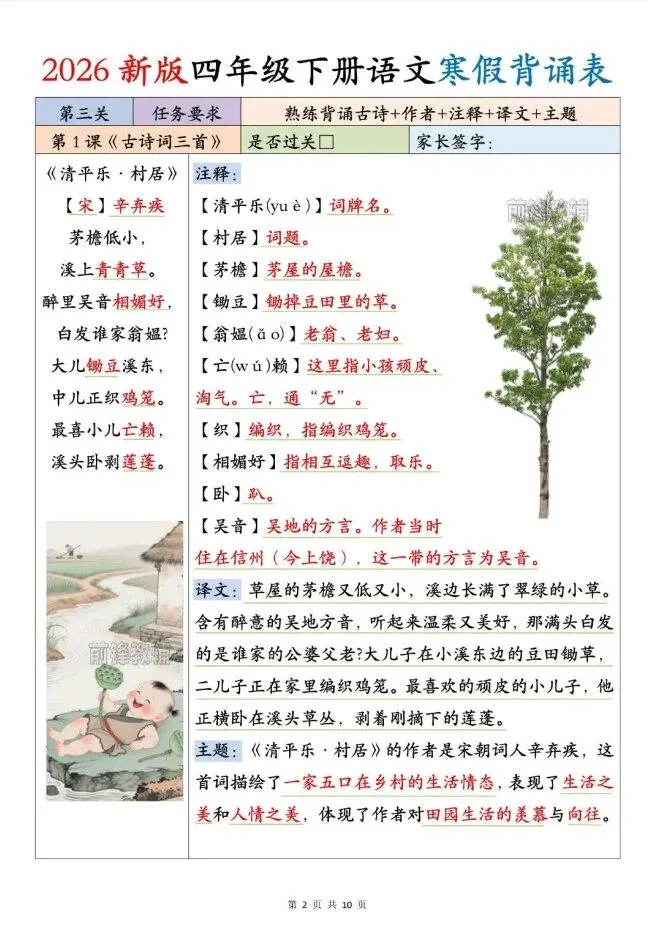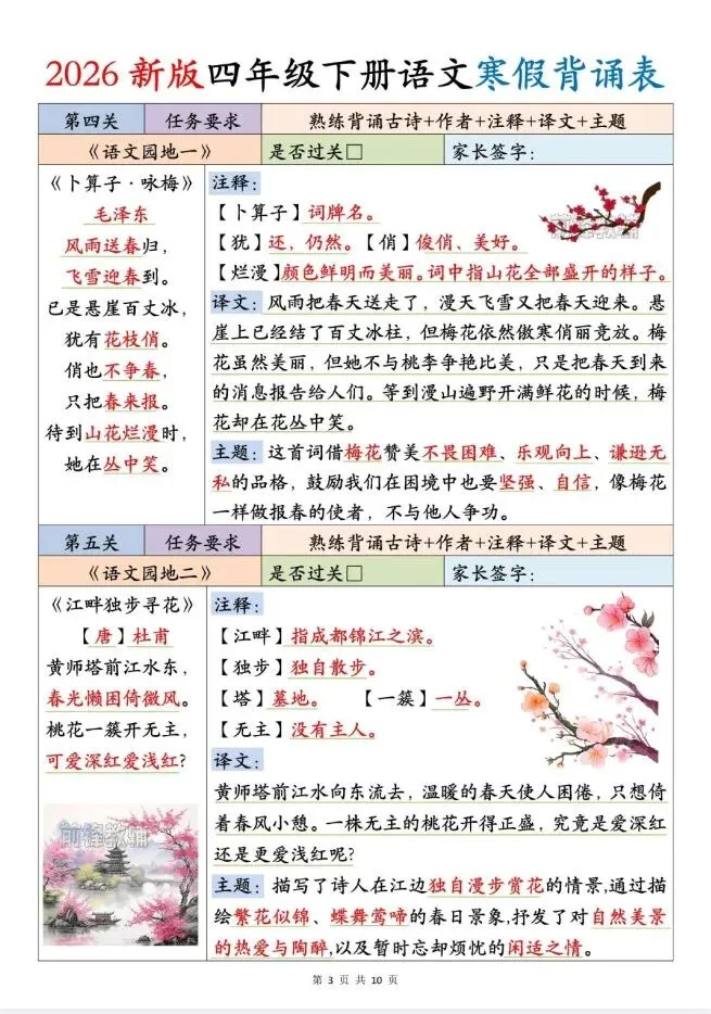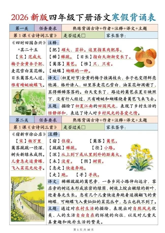 今天给大家整理了2026新版四年级下册语文寒假背诵表,转发给朋友或班级群,受益更多人,帮助孩子学习!