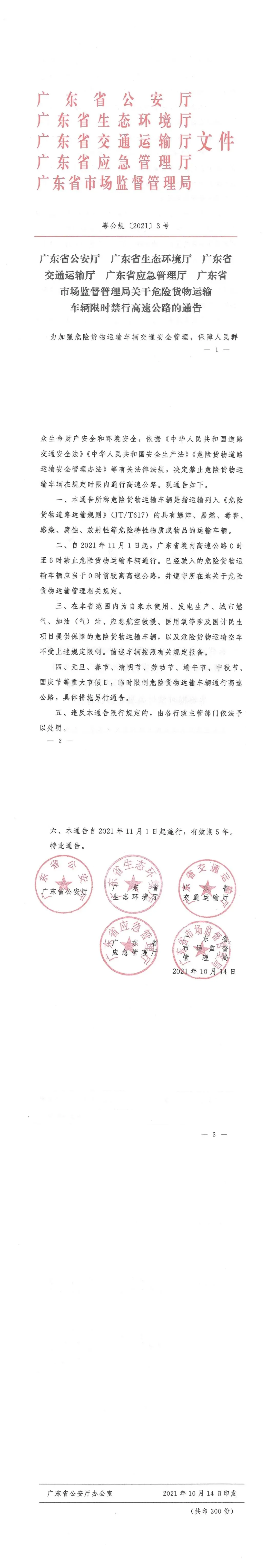 二、自2021年11月1日起,广东省境内高速公路0时至6时禁止危险货物运输车辆通行。已经驶入的危险货物运输车辆应当于0时前驶离高速公路,并遵守所在地关于危险货物运输管理相关规定。