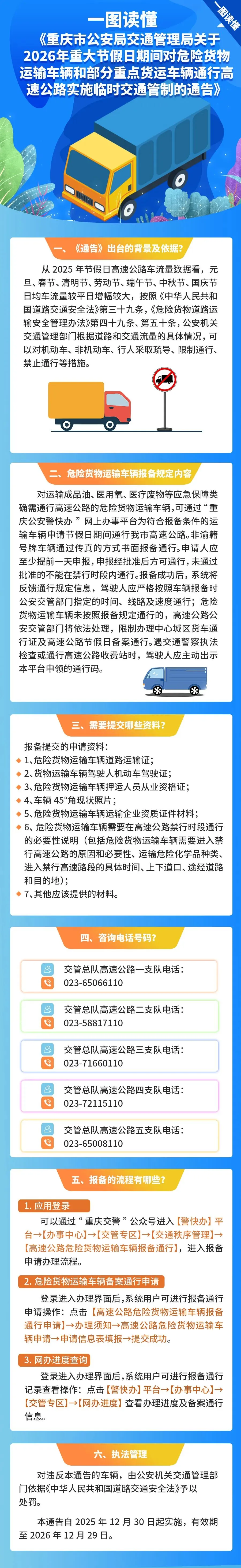 2026年元旦节、春节、清明节、劳动节、端午节、中秋节、国庆节期间,禁止危险货物运输车辆(含持有《剧毒化学品道路运输通行证》的危险货物运输车辆)在重庆市行政区域内高速公路行驶。高速公路服务区加油站供油供气或其他应急保障类危险货物运输车辆,经申请并批准后可在指定时段就近驶入和驶出高速公路。禁止通行具体时间安排如下: